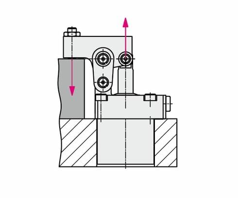 The flat lever clamp is available single or double acting. The piston moves upwards against the rear edge of the clamping lever and swivels the clamping lever to the clamping position. The piston force is deviated by 180° onto the workpiece. When unclamping the fl at lever clamp, the clamping lever is swivelled back to the off-position by means of a hook-shaped carrier on the piston.