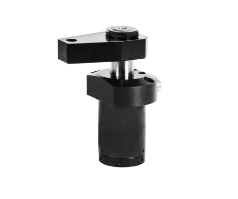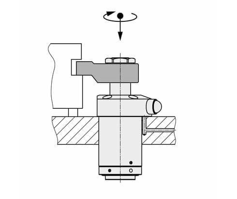 With swivelling clamping devices, workpieces can also be machined overhead. In the event of a sudden drop in clamping pressure, the radial anti-rotation device prevents the clamping arm from swivelling back. The workpiece is then no longer clamped. However, a sensible arrangement of several swing clamps and workpiece positioning aids can prevent the workpiece from falling out of the fixture (see also the note in the operating manual).