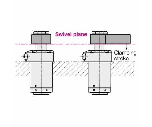 In this version without axial swing stroke, the clamping arm swivels in one plane and does not make any axial movement when swivelled.