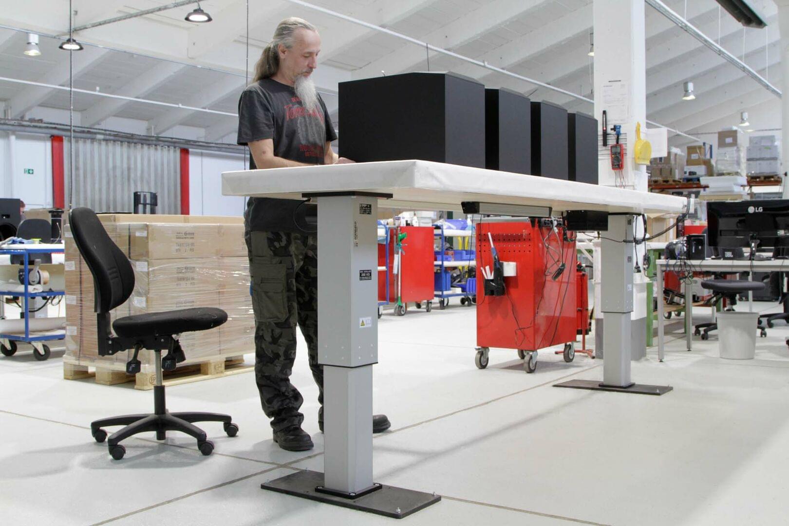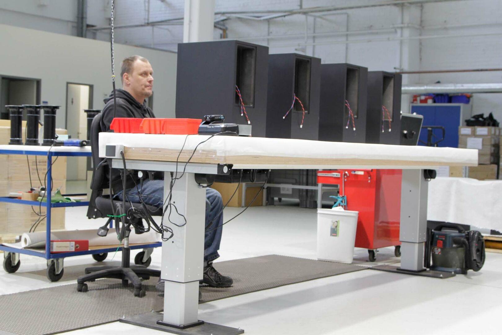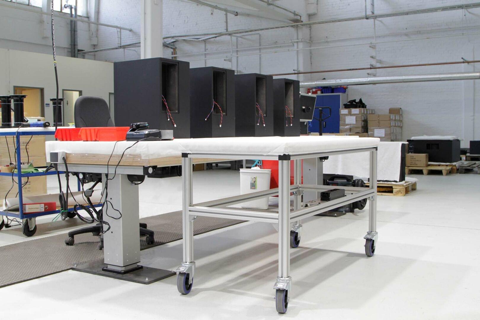 Bei ADAM Audio stehen die Montagetische, die jeder Mitarbeiter auf die für ihn ergonomisch angenehme Höhe fahren kann, im Mittelpunkt der Neuorganisation.
