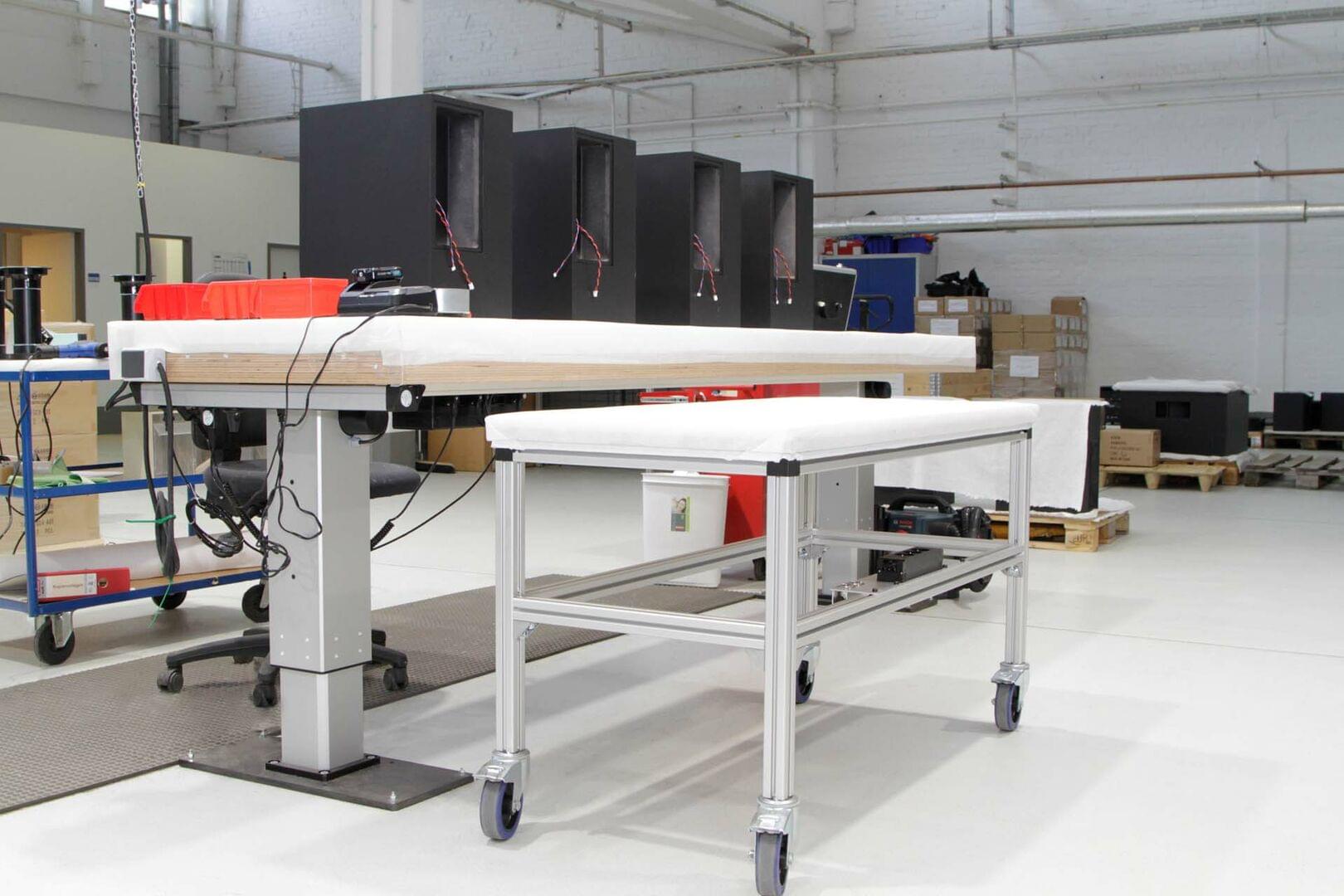 Im Herbst 2018 entschied sich ADAM Audio nach intensiver Suche und Onlinerecherche für Montagetische aus dem „moduhub“-Programm von ROEMHELD, deren Höhe über jeweils zwei elektrische Hubsäulen verstellt werden kann. Die jeweils 3.000 mm breiten, 800 mm tiefen und 60 mm dicken Tischplatten tragen bis zu 400 kg Last. Damit waren sie laut Brau die einzigen am Markt verfügbaren Modelle, die infrage kamen. Die ersten beiden Exemplare wurden im Dezember 2018 geliefert, das dritte folgte im März 2019.