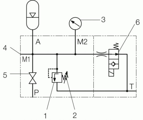 The pressure relief valve shall protect the hydraulic accumulator against a pressure increase by more than 10 % of the maximum operating pressure.Adjustment has to be effected with the maximum flow rate of the power unit. The reaction pressure of the pressure relief valve should be a little bit higher than the nominal pressure of the hydraulic accumulator.