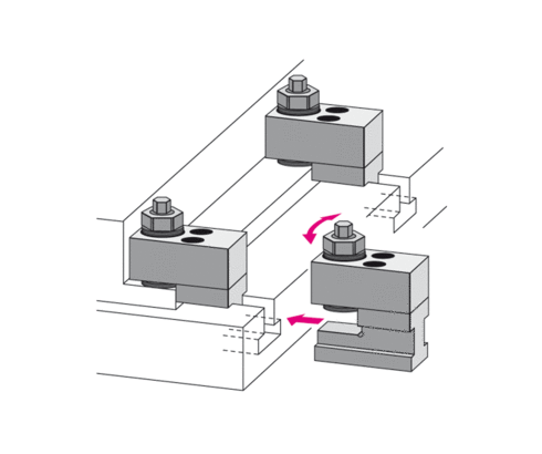 The sliding clamp is manually placed in the T-slots and screwed against the die clamping edge. The clamping force is built up by turning the hexagon nut in clockwise direction.