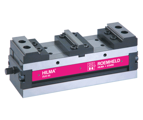 Double clamping systems HILMA.DUO convince by their short overall length, durability and precision. The guidance and sealing principle works without any delicate sheet metal covers or plastic wipers. The centrally arranged fixed jaw as a central jaw is without load and thus absolutely zero point stable.