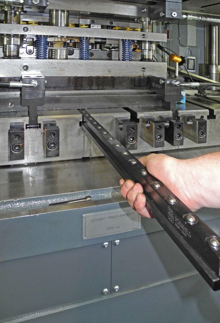 With a crane, we move the dies to the press. There we have carrying consoles, which are attached in appropriate hooks to the press. The die is placed on top of the consoles. We first push the hydraulic ball bars into the T-slots of the press bed. The die is then pushed over the rollers of the carrying consoles onto the balls of the bars, there it is lifted and can be precisely positioned horizontally and vertically by the operator without great effort. Once this has been done, the balls are lowered and the die is fixed with the sliding clamps.