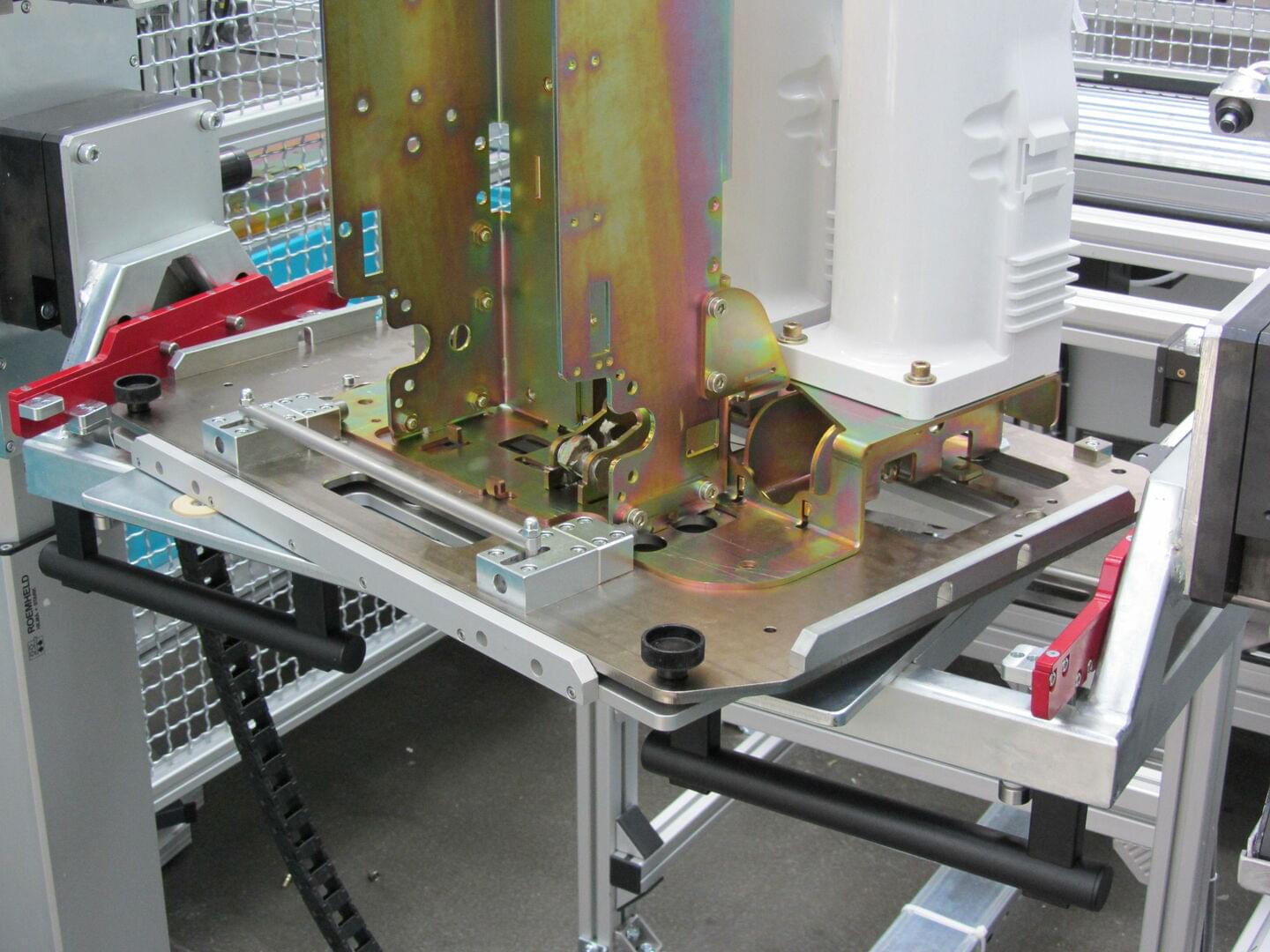 “For this line, we divided the assembly work into three steps and designed the corresponding manual workstations,” remembers Petra Stielow. First, the basic components of the support plate, pole plate and the poles are assembled, the pole plate is fixed by hand on the side of a stop. “This prevents it from slipping and at the same time the subassembly is optimally positioned at the centre of gravity,” emphasises the designer.
