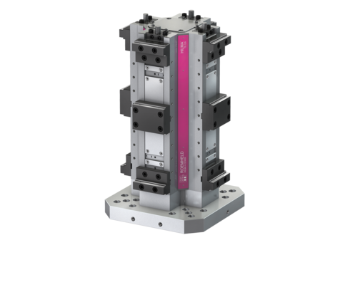 Mechanically-operated square clamping tower "HILMA.TS 125" for use in series production with floating central jaw for 16 workpieces. The machine runtime is considerably increased. The tower clamping system is also suitable for clamping of complex workpiece contours and the simultaneous machining of components with identical and different dimensions in horizontal machining centres. The patented guide and sealing system guarantees maximum process safety, even for complex machining tasks. The aluminium base plate can be adapted to a wide variety of machine pallets.