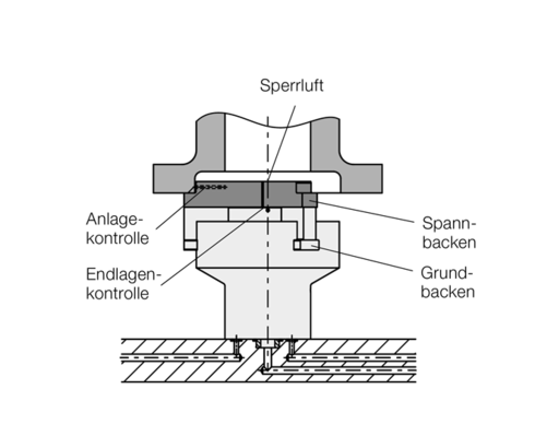 La conexión para la estanqueidad del aire puede también utilizarse para el control de la posición de desblocaje. Las mandíbulas que retroceden cierren en la posición final los orificios de soplado del aire para estanqueidad.